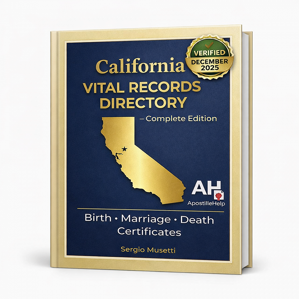Portada del “Directorio de Registros Vitales de California – Edición Completa”. Incluye actas de nacimiento, matrimonio y defunción, con información verificada por condado y guía para solicitar copias certificadas y apostillas.